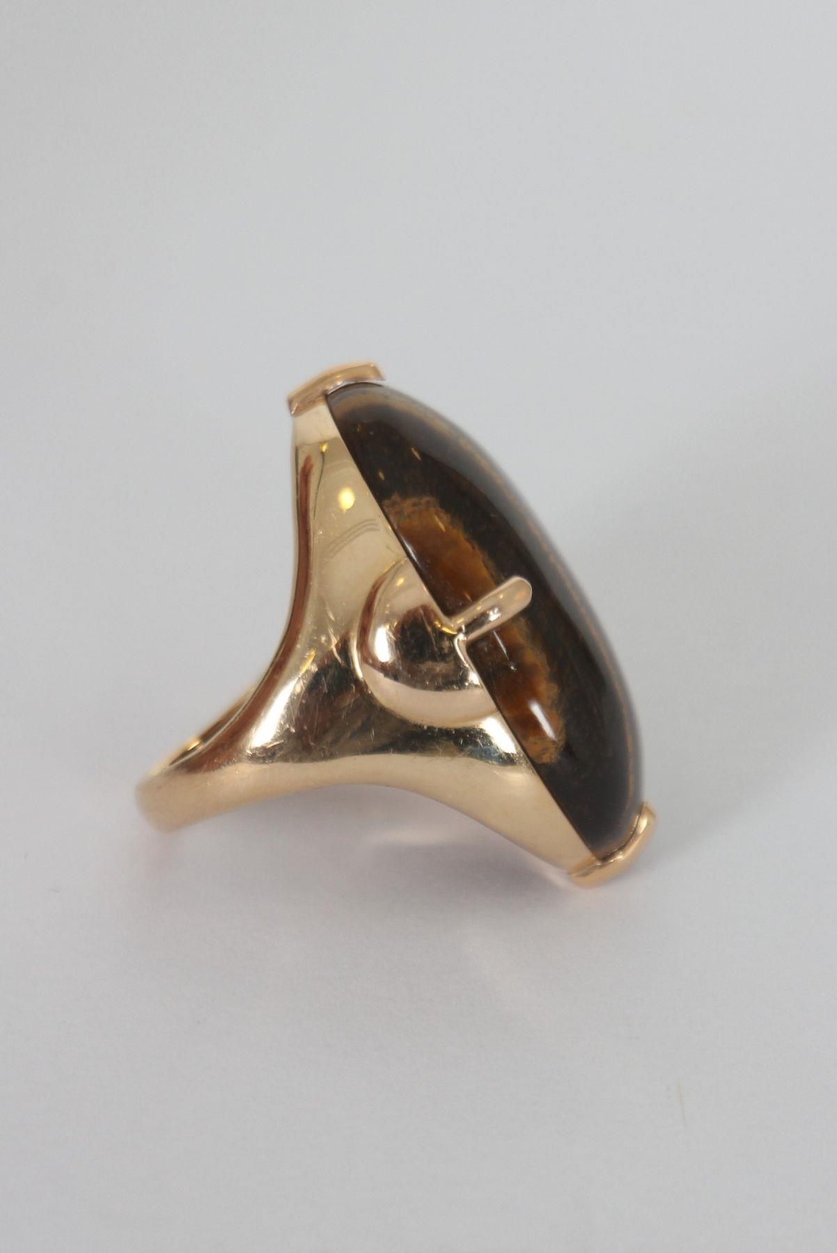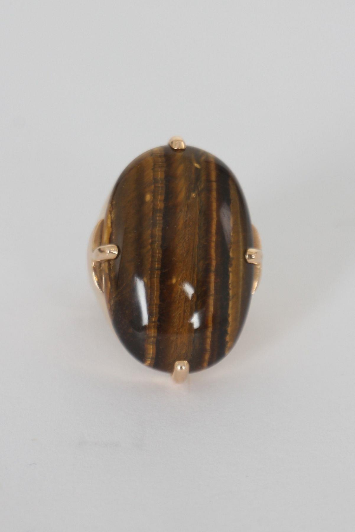 - Anel em ouro dourado- Estrutura circular ampla- Pedra olho de tigre superior- Garras laterais.