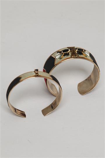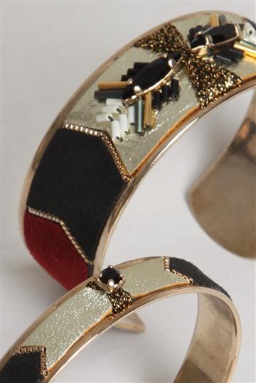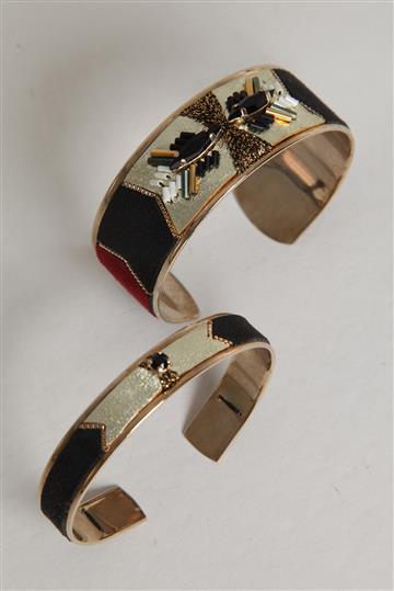 - Dupla de braceletes em metal e camurça