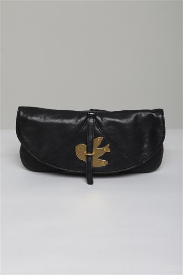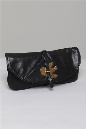 - Aba superior com tira central e adorno metálico de pássaro