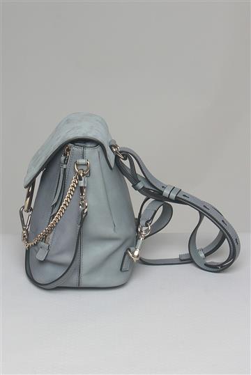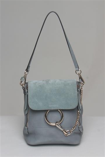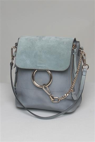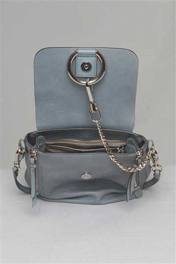 - Aba superior em camurça com fecho de encaixe interno e argola metálica ampla com corrente