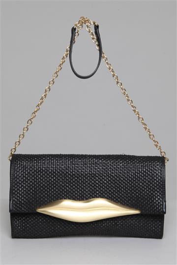 - Aba superior com grande adorno metálico em formato de boca e fecho imantado interno