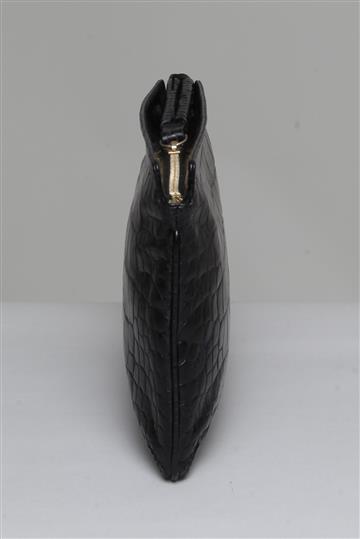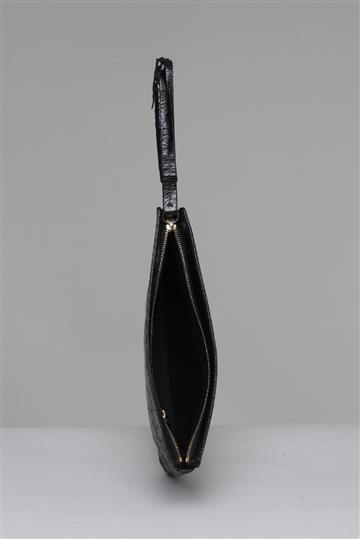 - Abertura superior com zíper aplicado e puxador ornamentado para fechamento
