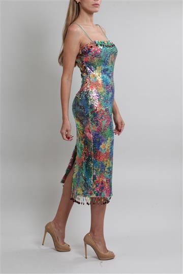 Vestido Bronx & Banco Longo Paetês com Franja Dourado