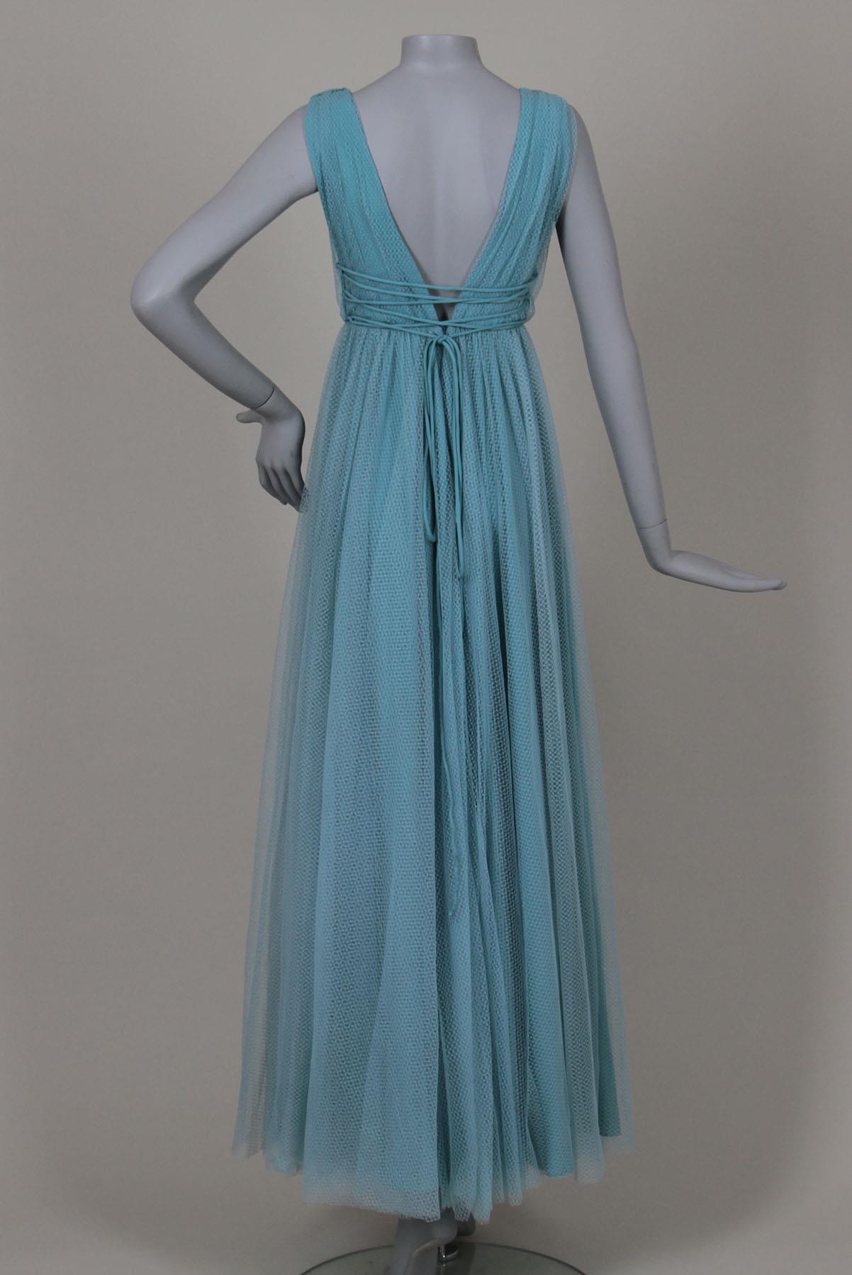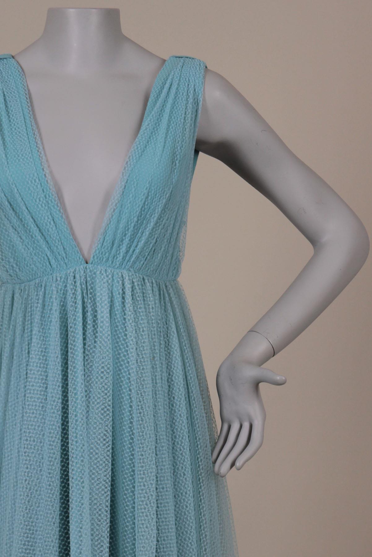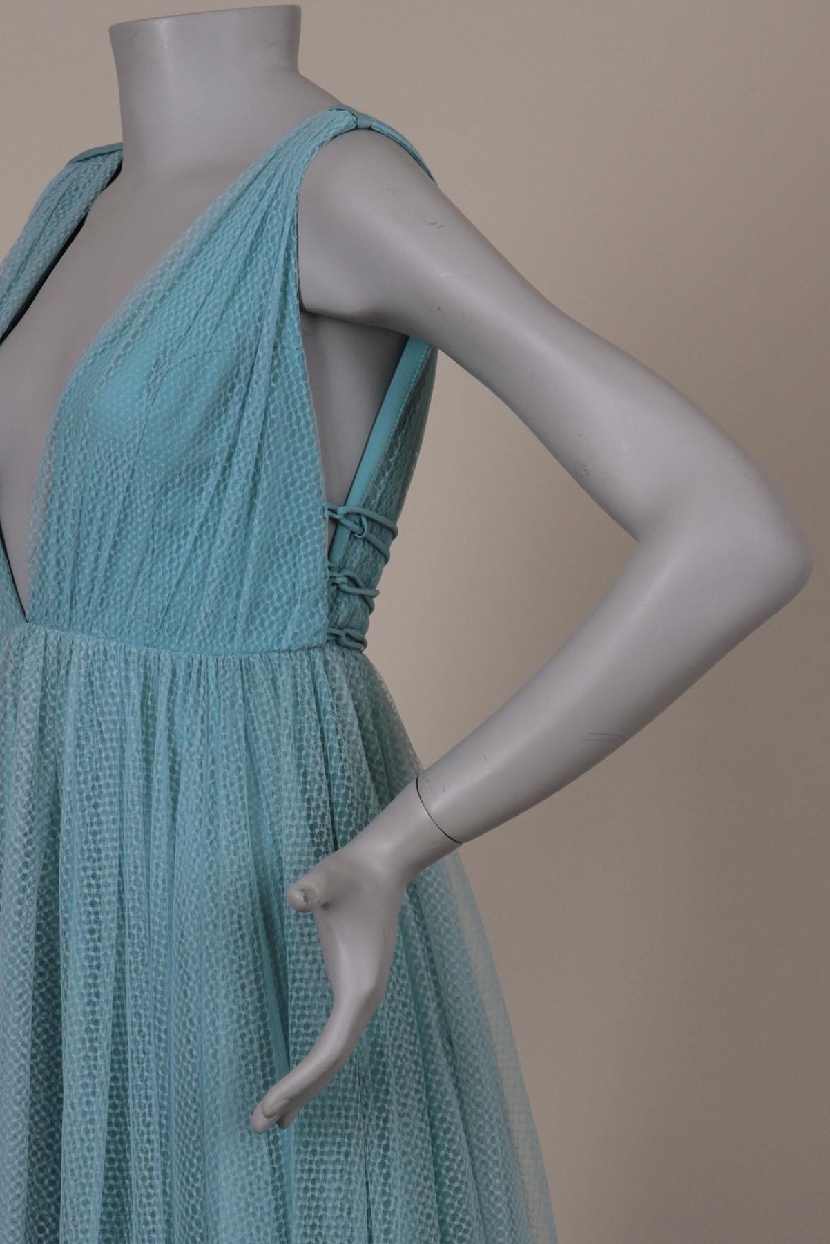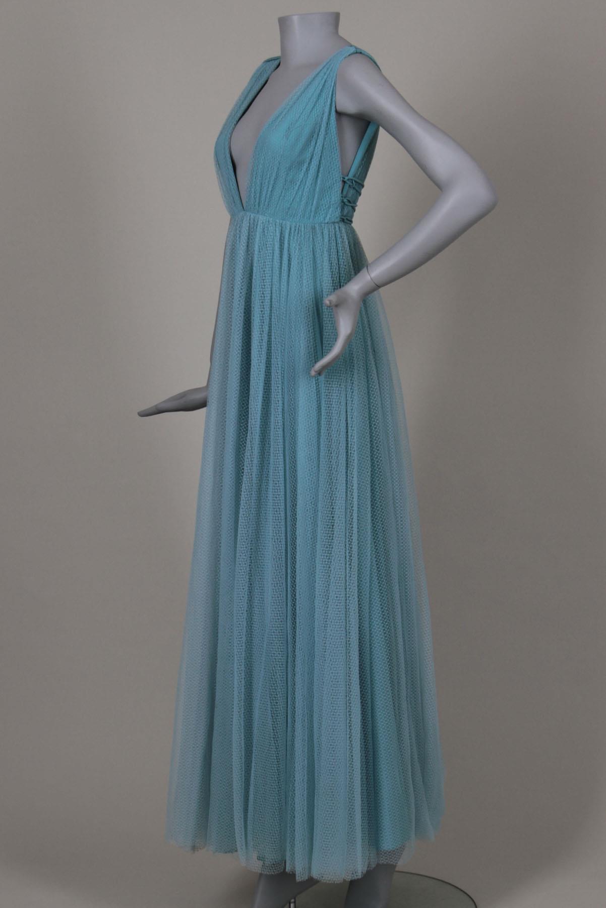 - Vestido em tule- Azul turquesa- Modelagem evasê de comprimento longo- Decote frontal e traseiro em 'V'- Ombros com drapeado decorativo- Amarração traseira estilo corset customizável