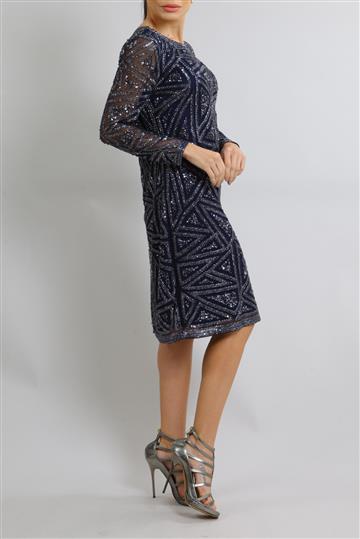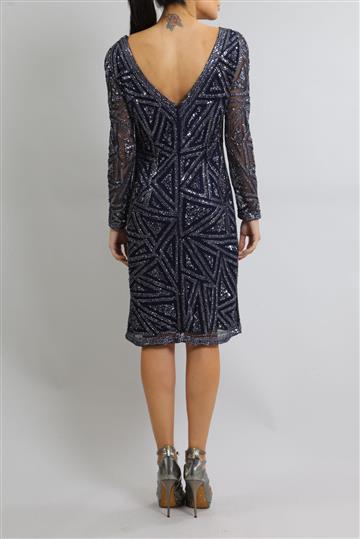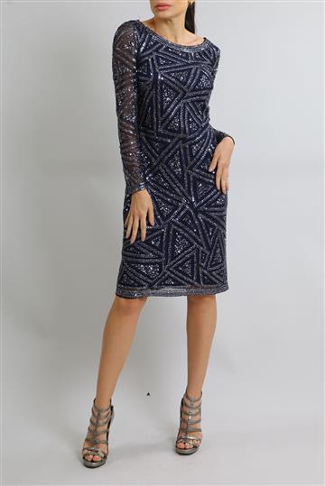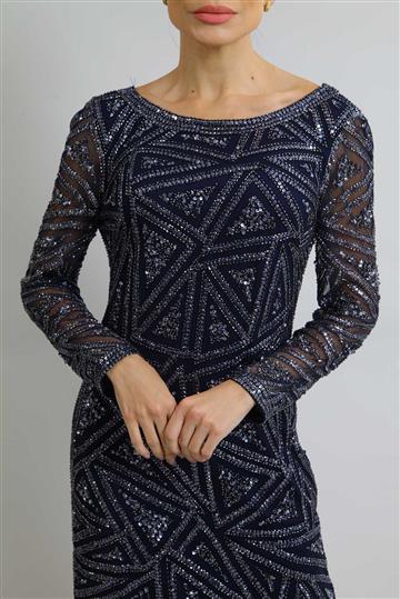 - Bordados geométricos com paetês e pequenos canutilhos aplicados