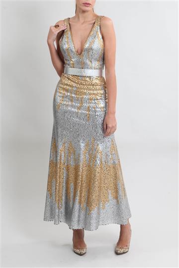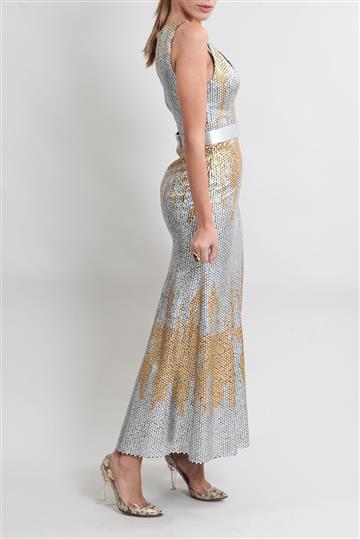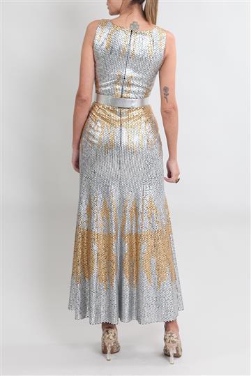- Vestido em tecido telado inteiramente revestido por pequenas esferas em couro metalizado