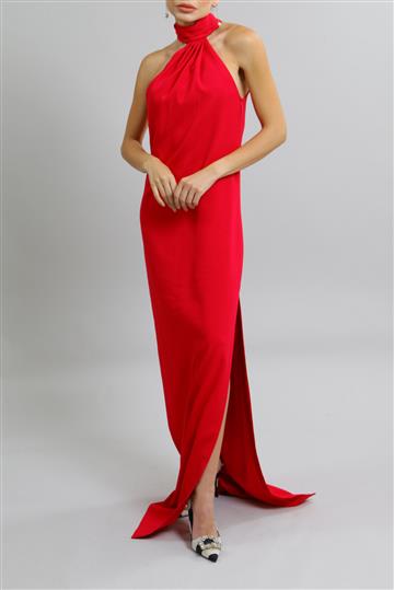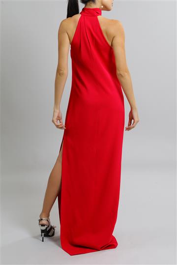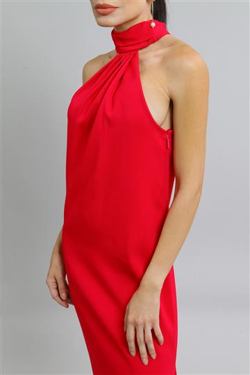 - Decote trapézio com gola alta drapeada ajustada ao pescoço