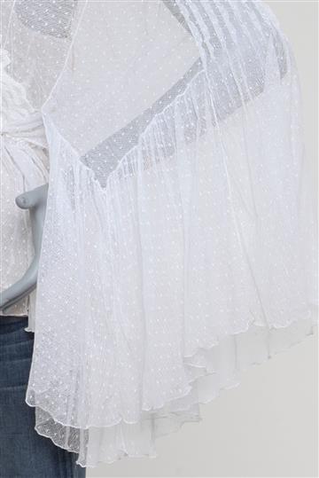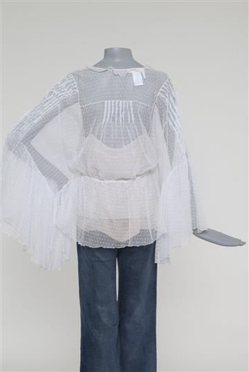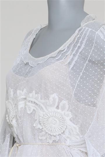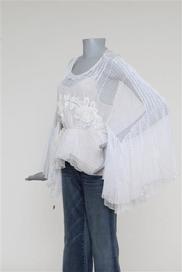 - Tramado ornamentado por pequenos poás e bordado floral central