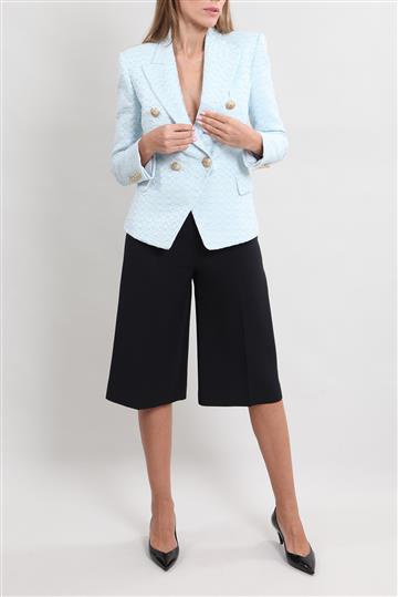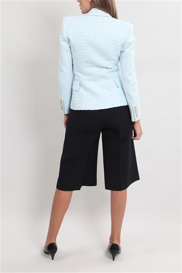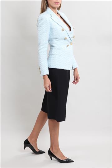 - Fechamento frontal por abotoamento duplo com botões metálicos ornamentados