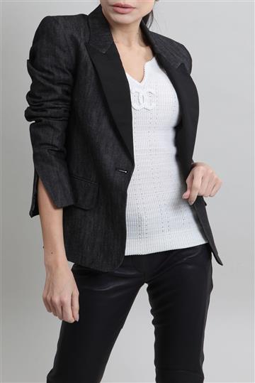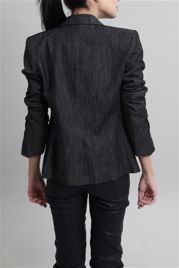 - Blazer em jeans encorpado com detalhes em gorgurão
