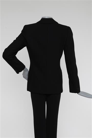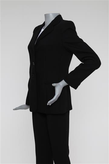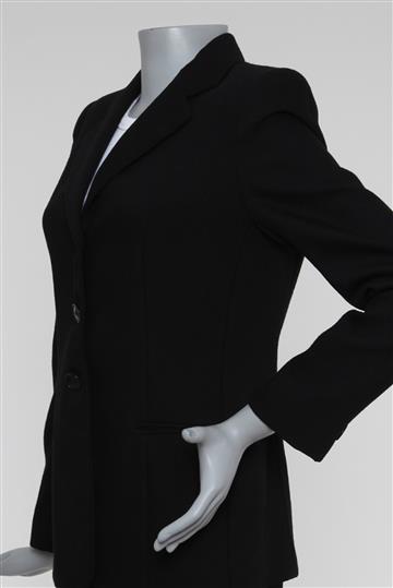 - Decote alongado em 'V' com lapelas duplas clássicas