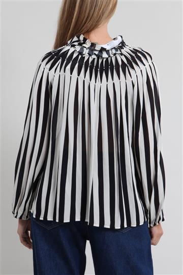 - Mangas longas bufantes com pregueado duplo e punhos elásticos