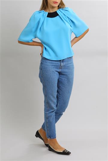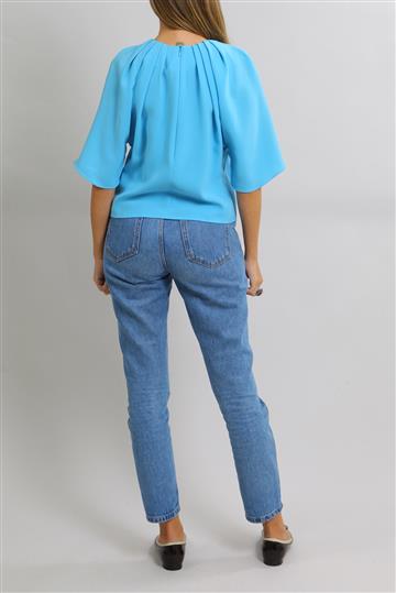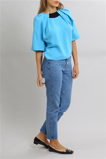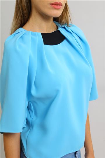 - Decote arredondado alto com pregueado ao redor