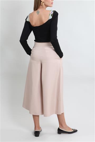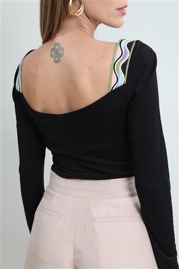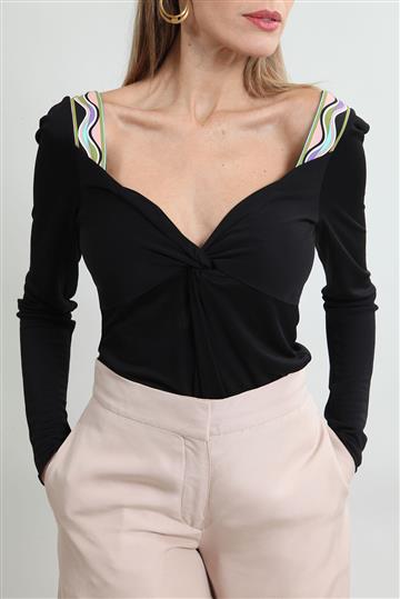 - Decote amplo em 'V' com nó decorativo central