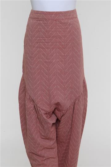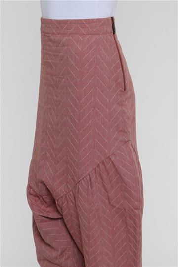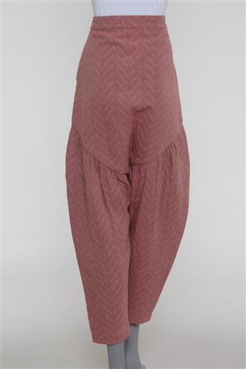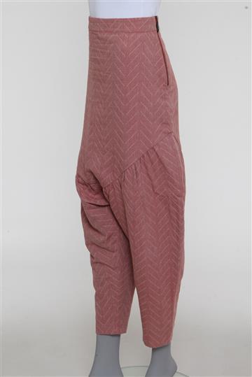 - Calça em tecido texturizado e de toque macio- Rosê mesclado total- Padronagem geométrica decorativa de tonalidade complementar- Modelagem reta e ampla estilo saruel- Cintura alta com cós reto- Pala anatômica alongada com pregas aparentes- Pernas amplas com barras afuniladas- Comprimento ligeiramente mais curto- Fechamento lateral por zíper tratorado aplicado