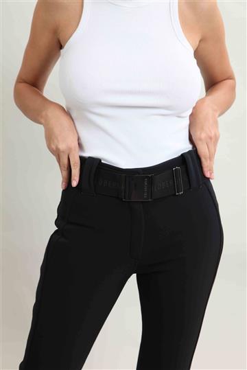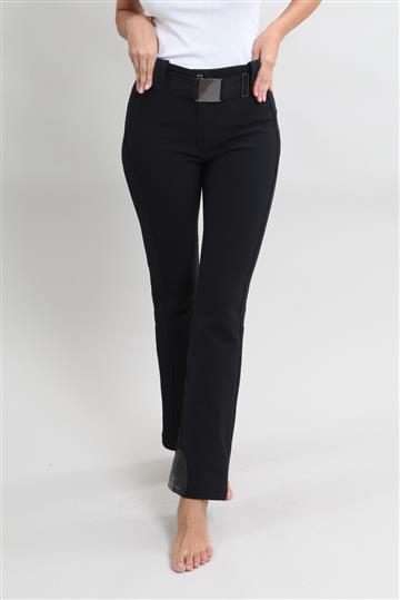 - Cintura alta com passantes aplicados e cinto elástico com fivela metálica frontal