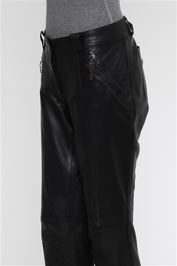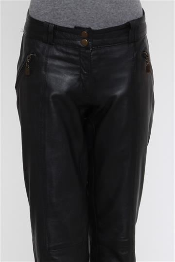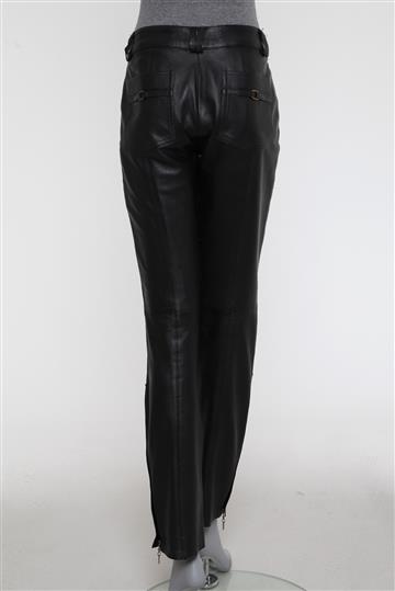 - Calça em couro puro- Preto total- Modelagem reta- Cintura baixa- Cós reto de espessura mediana com passantes duplos- Dois bolsos frontais com zíperes aplicados para fechamento- Dois bolsos posteriores com detalhe metálico aplicado- Recortes e pespontos aparentes- Zíperes tratorados aplicados à lateral das pernas- Barras à fio- Comprimento alongado- Fechamento frontal por abotoamento duplo e zíper oculto.