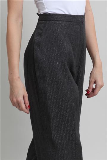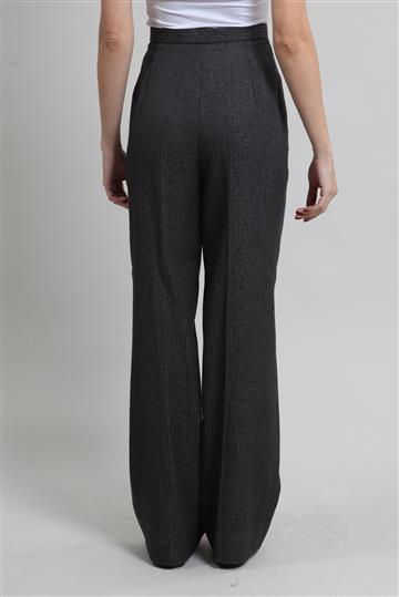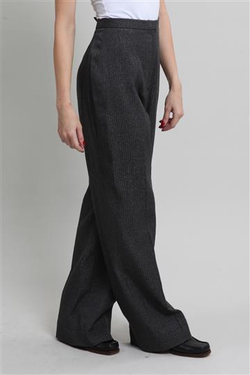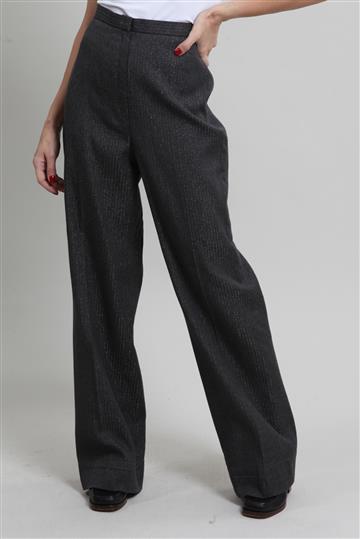 - Calça em lã e poliéster- Cinza grafite- Tramado decorativo de listras com leve brilho- Modelagem reta de comprimento alongado- Cintura alta- Cós reto- Fechamento frontal por zíper oculto e colchetes