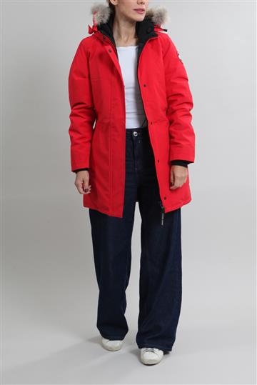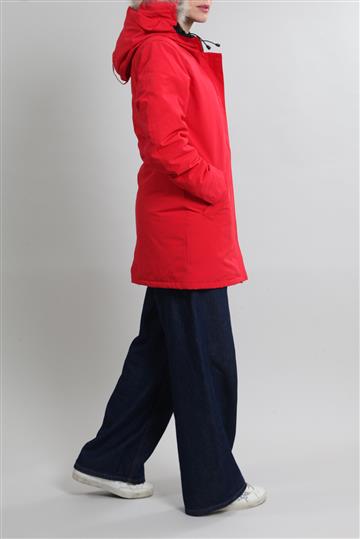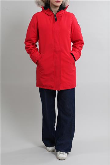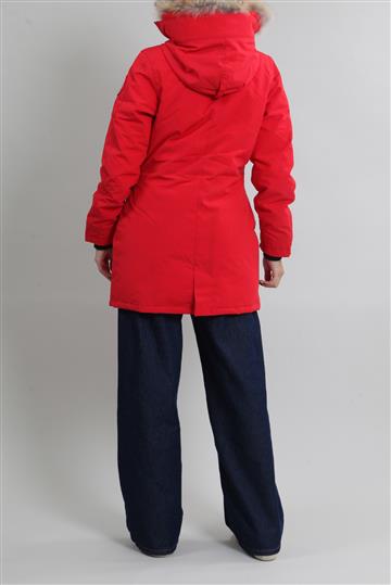 - Casaco em nylon encorpado com forro por penas de pato e gola em pele de coiote