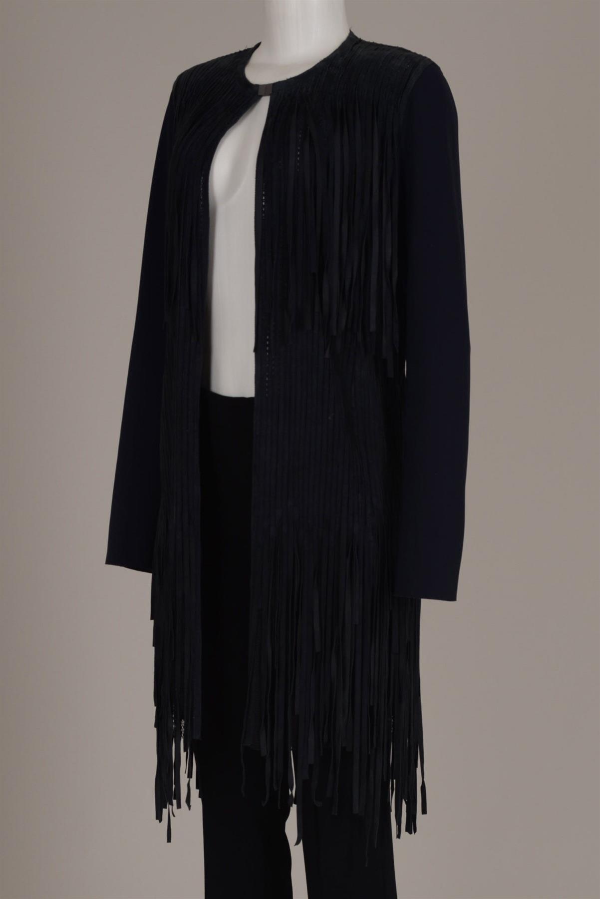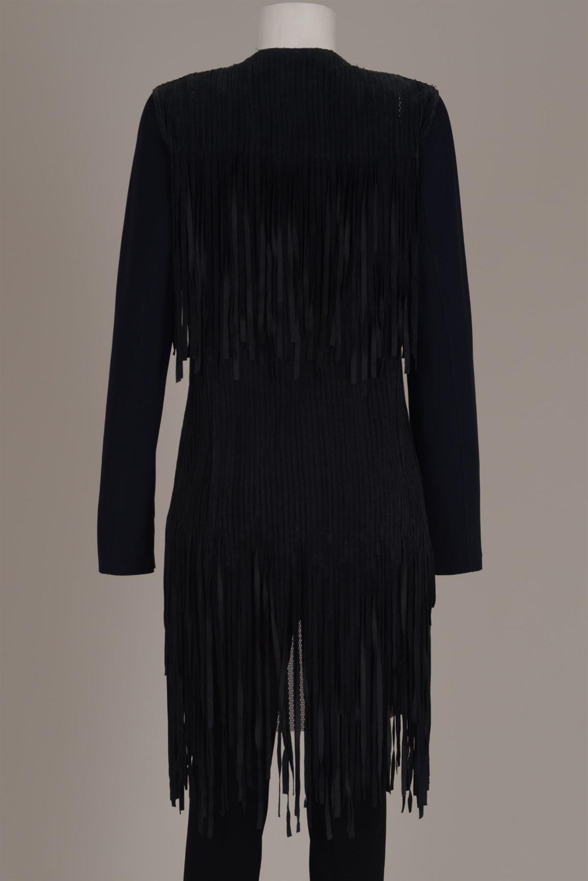 - Casaco em couro e neoprene- Preto- Decote arredondado com fechamento por encaixe- Abertura frontal- Mangas longas- Franjas decorativas em camadas- Comprimento alongado.