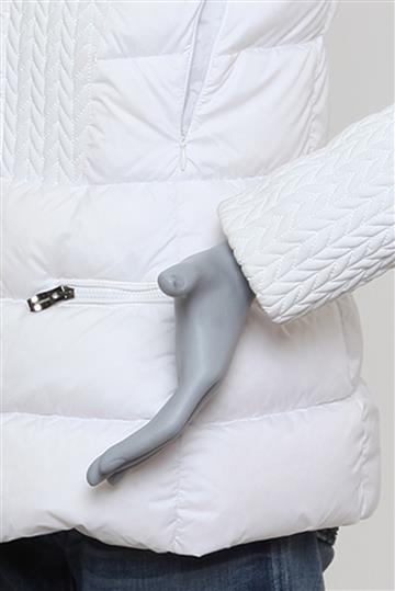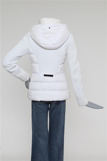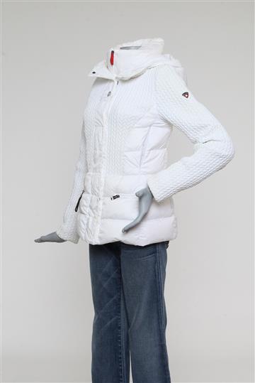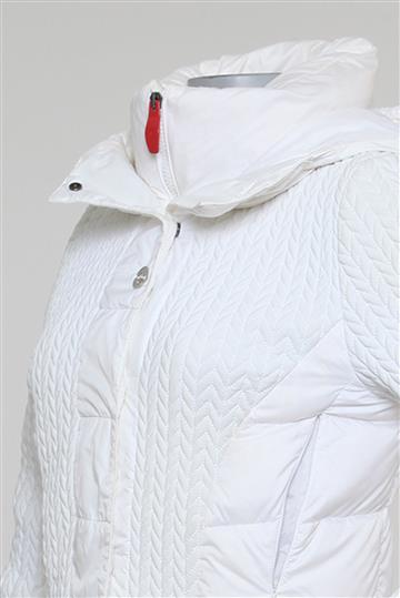 - Modelagem reta e ligeiramente acinturada com gola alta ampla e capuz superior
