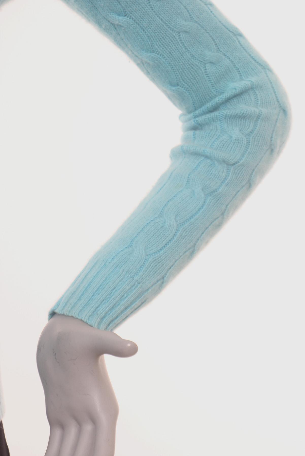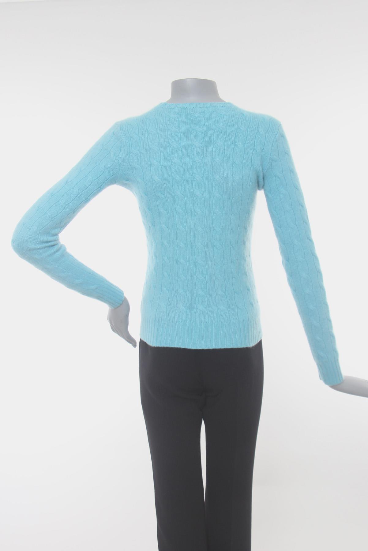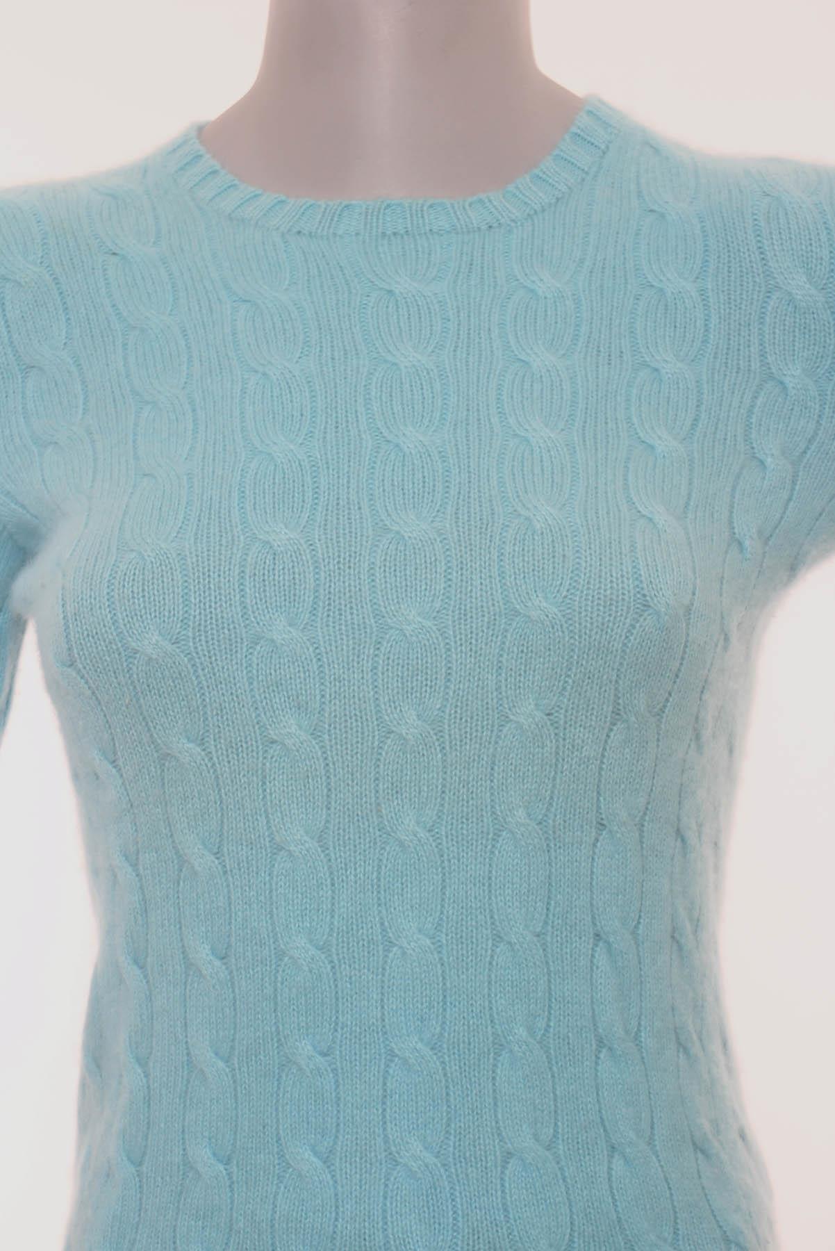 - Suéter em cashmere- Azul celeste- Modelagem ajustada ao corpo- Decote arredondado- Mangas longas- Punhos e barra canelados- Tramado decorativo clássico de tranças