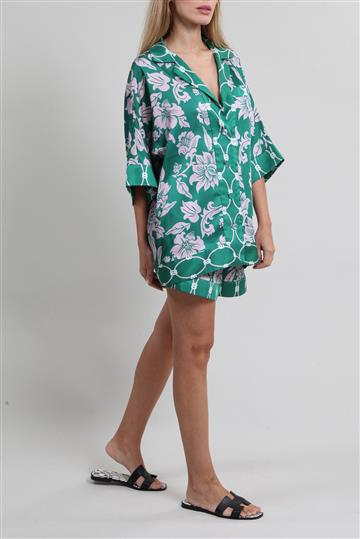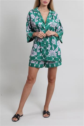 - Conjunto em tecido leve e acetinado de caimento fluido