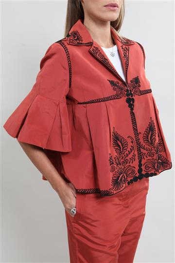 - Casaqueto possui modelagem reta e ampla com pala pregueada inferior