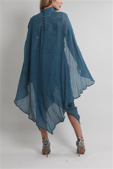 - Capa superior possui modelagem ampla e fluida com gola alta estruturada e abotoamento posterior por botões forrados