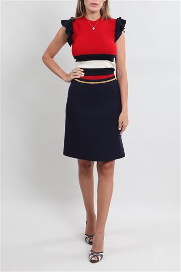 - Cintura alta com cós reto e detalhe decorativo em lurex matelizado