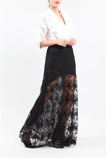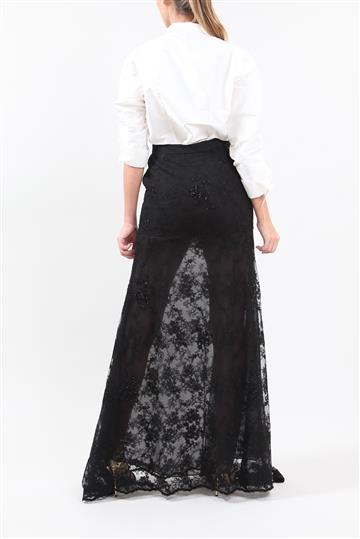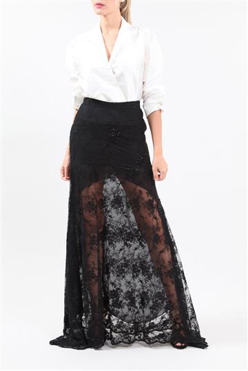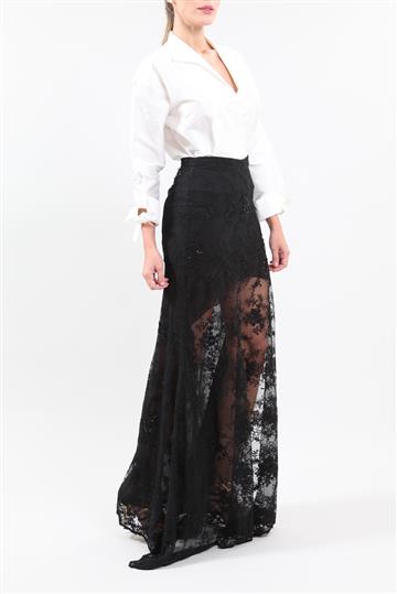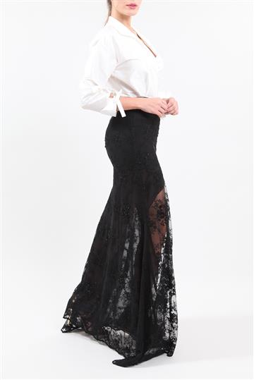 - Saia em tule e renda- Comprimento longo- Modelagem evasê sereia- Cós reto com zíper lateral para fechamento- Bordados decorativos com canutilhos- Leve transparência