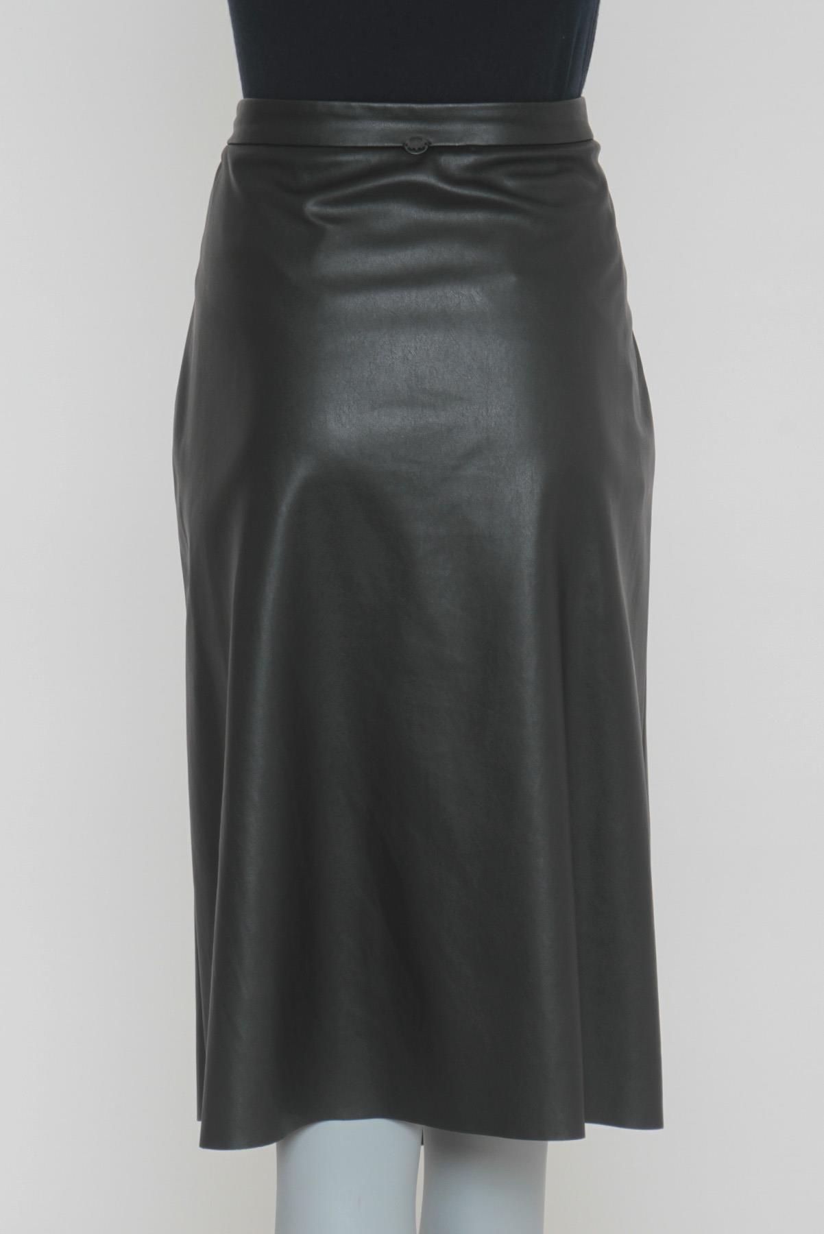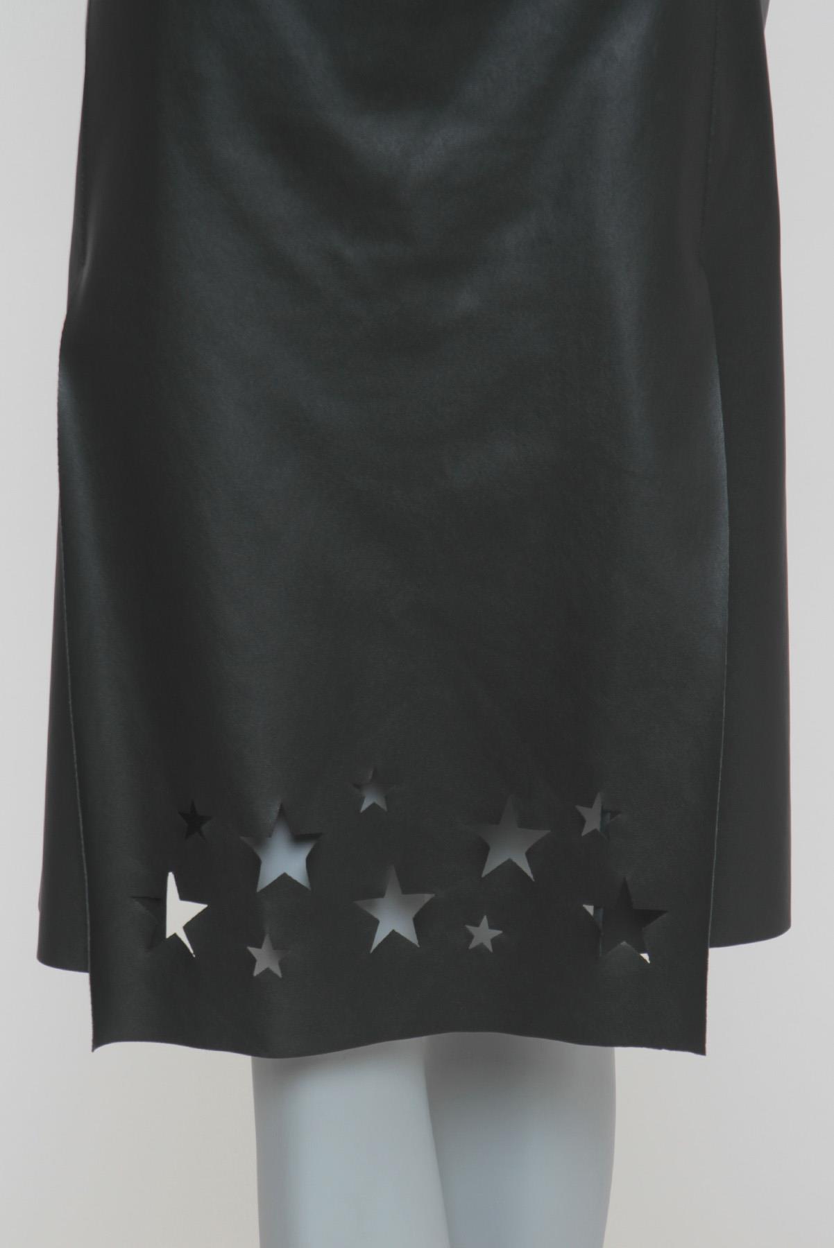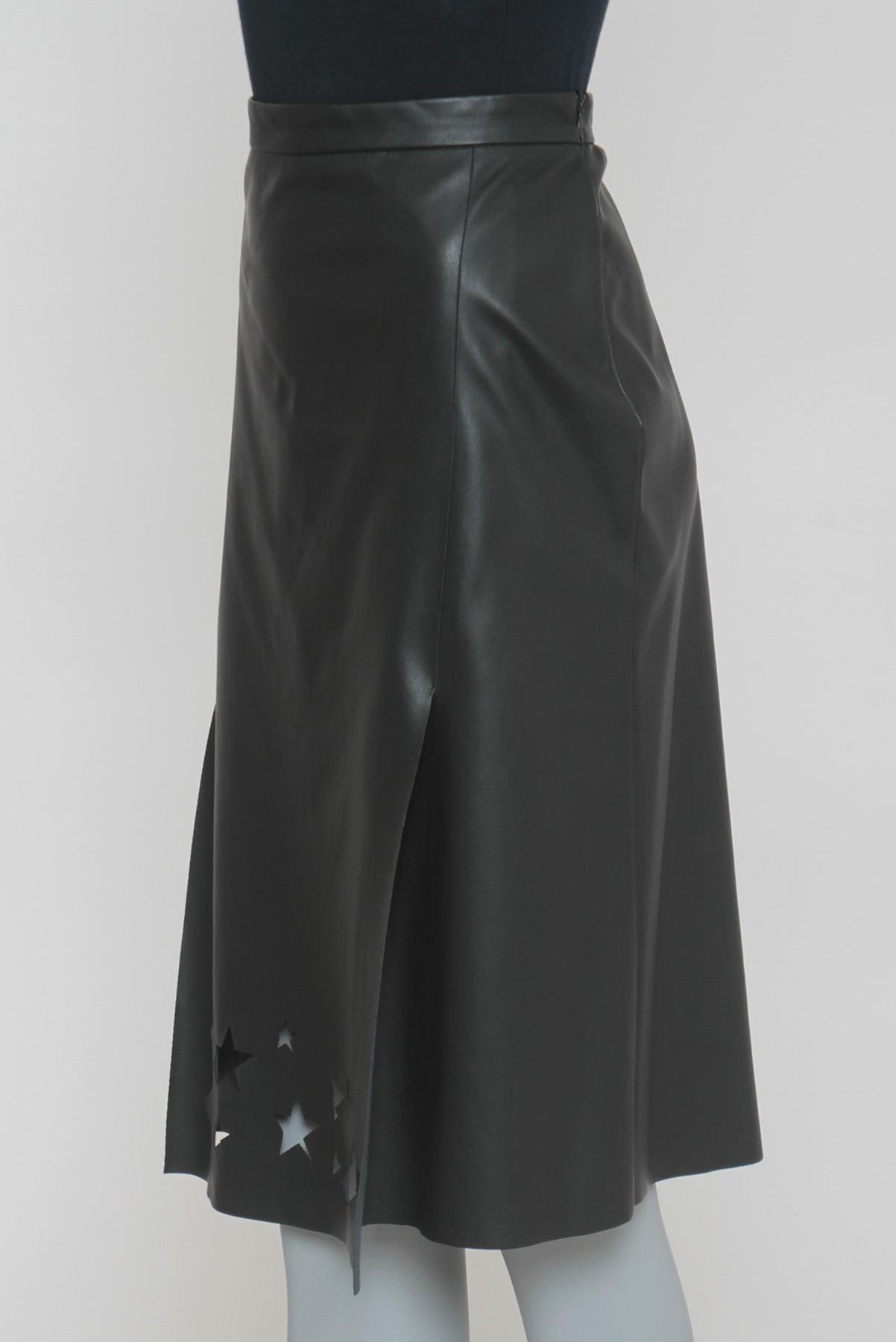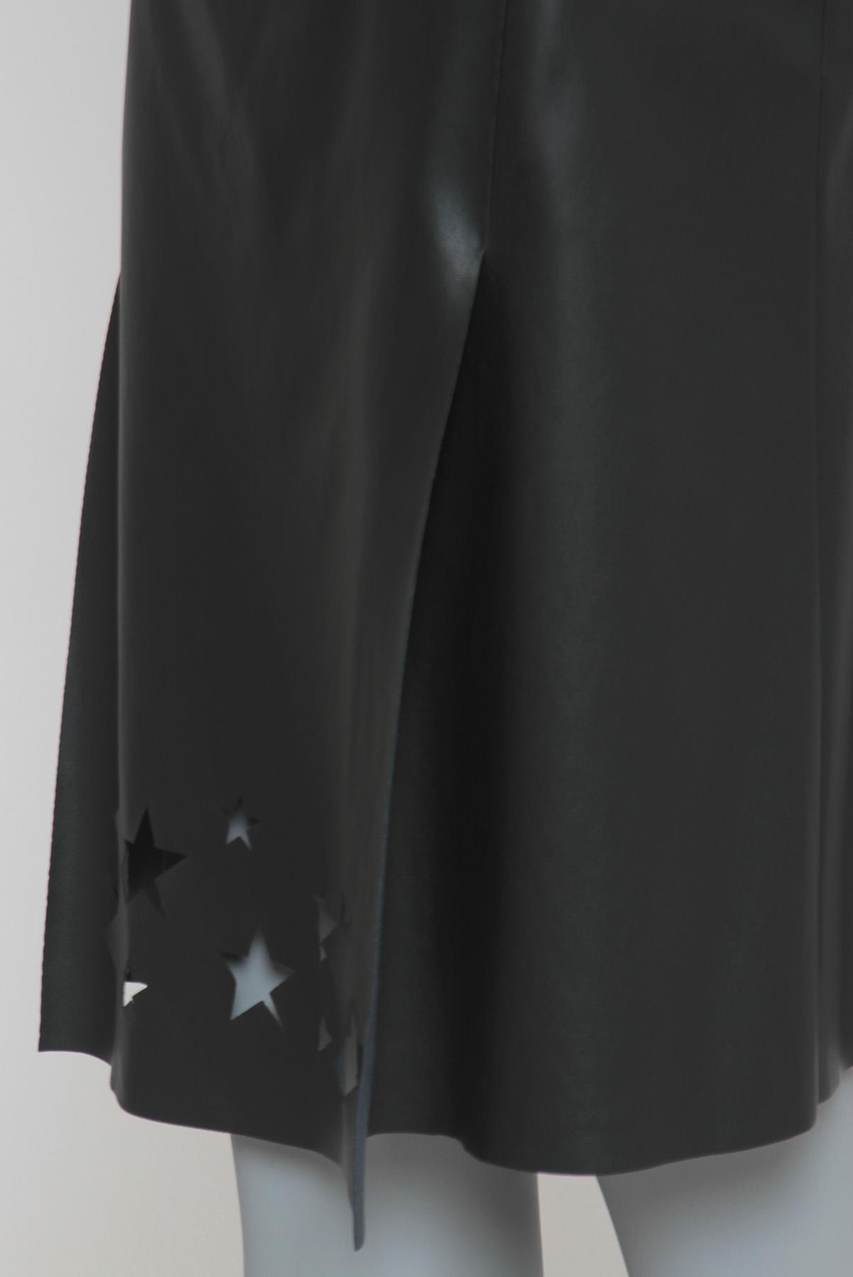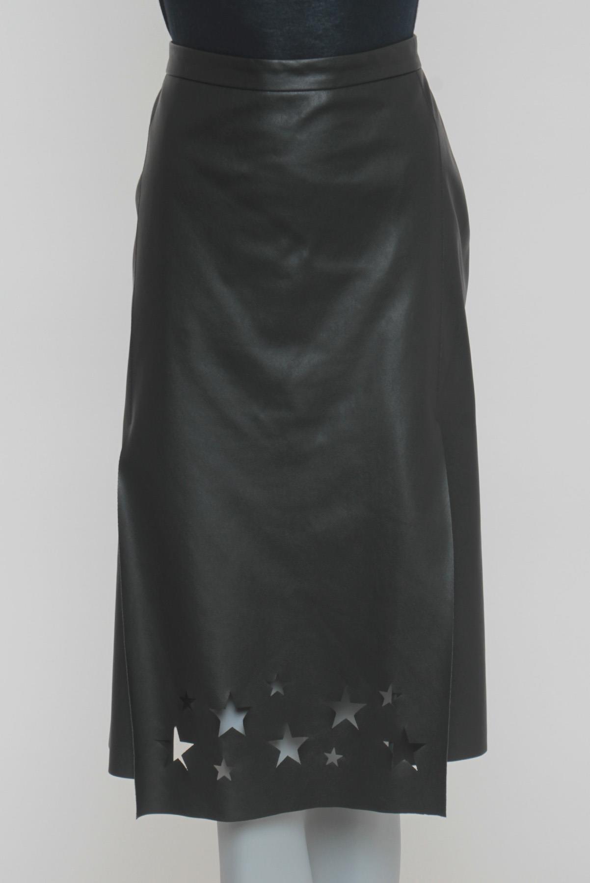 - Saia em couro sintético- Preto- Modelagem reta em 'A'- Cós reto de espessura mediana- Fendas frontais- Recortes vazados decorativos no formato de estrelas- Barra à fio- Comprimento midi- Fechamento lateral por zíper invisível