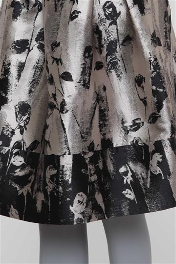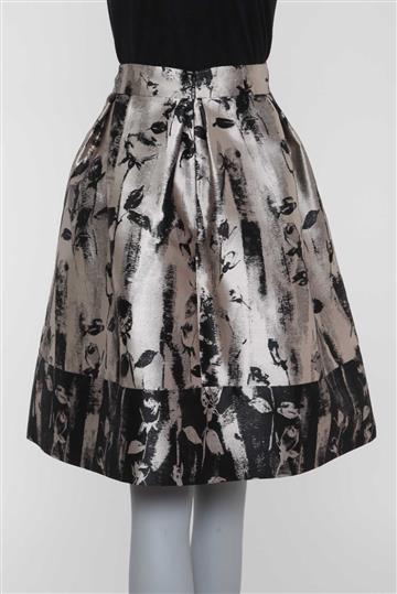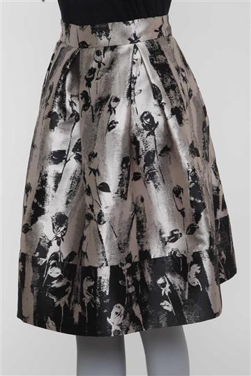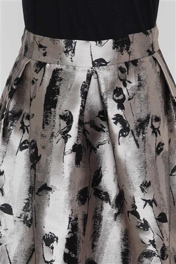 - Saia em tecido encorpado e estruturado à base de seda- Cinza e preto com leve brilho metalizado- Tramado ornamentado por motivos botânicos- Modelagem godê ampla- Cintura alta com cós reto e estruturado- Pregas aparentes- Dois bolsos laterais funcionais- Comprimento midi- Fechamento posterior por zíper invisível