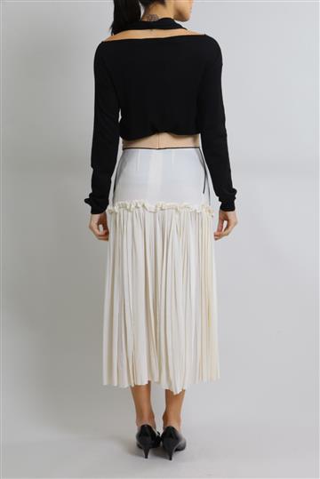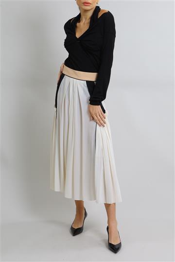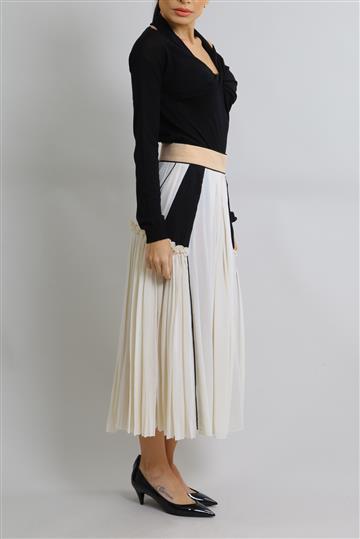 - Saia em seda- Bicolor em tons de off white e preto com detalhes em rosê- Modelagem godê ampla- Cós reto- Dois bolsos laterais funcionais- Recortes com pregas decorativas- Babados aplicados- Comprimento midi- Fechamento lateral por zíper invisível