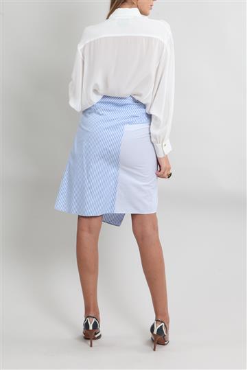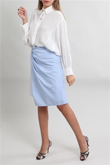- Pala drapeada assimétrica e sobreposta com fivela metálica aplicada
