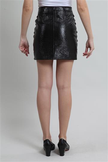 - Saia em couro sintético e texturizado de aspecto envernizado