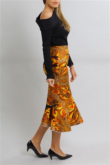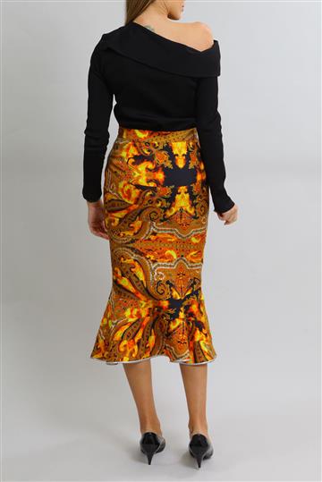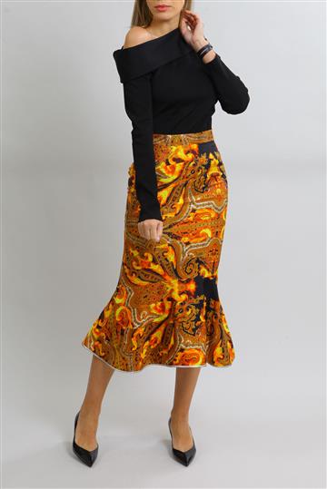 - Mix de tons de laranja com detalhes em preto, branco e bege