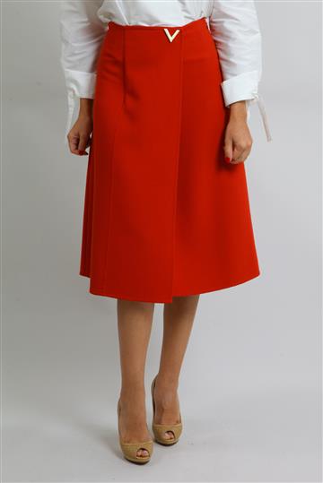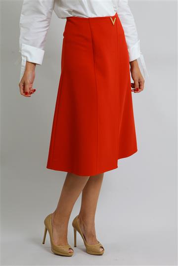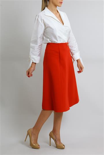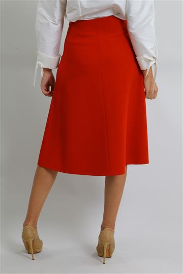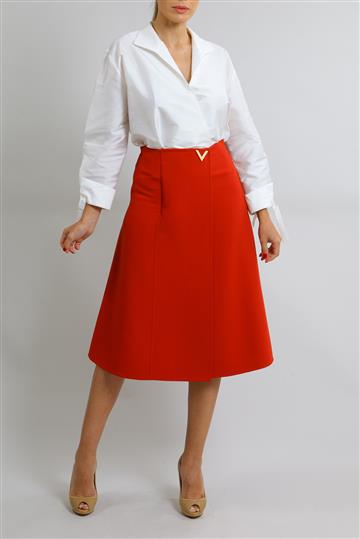 - Saia em lã virgem encorpada e estruturada- Vermelho vivo total- Modelagem evasê ampla com silhueta em 'A'- Cintura alta com cós reto- Plaqueta metálica central com encaixe de pressão posterior para fechamento- Recortes aparentes para melhor vestibilidade- Fenda central alongada e transpassada- Comprimento midi- Fechamento lateral por zíper invisível aplicado