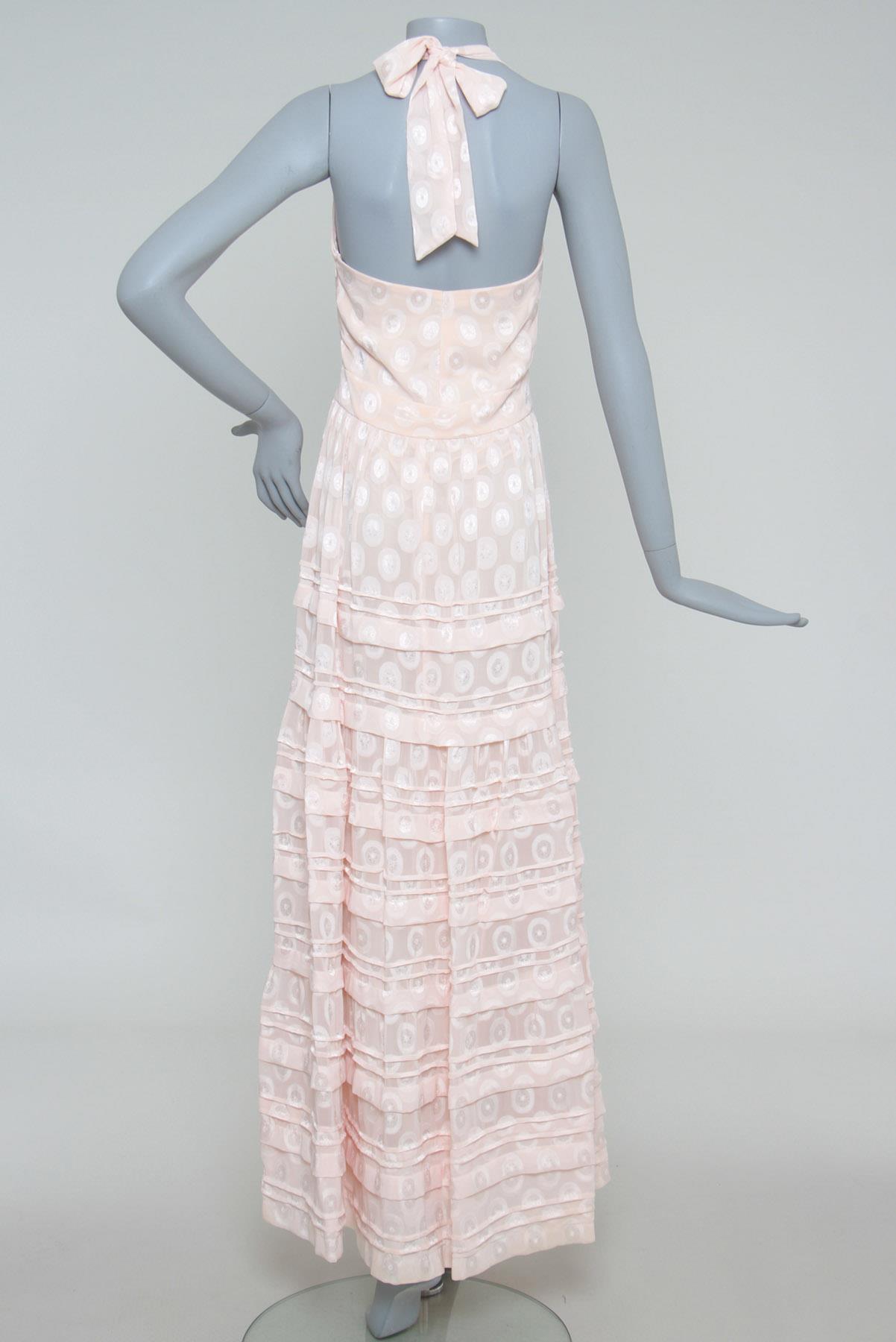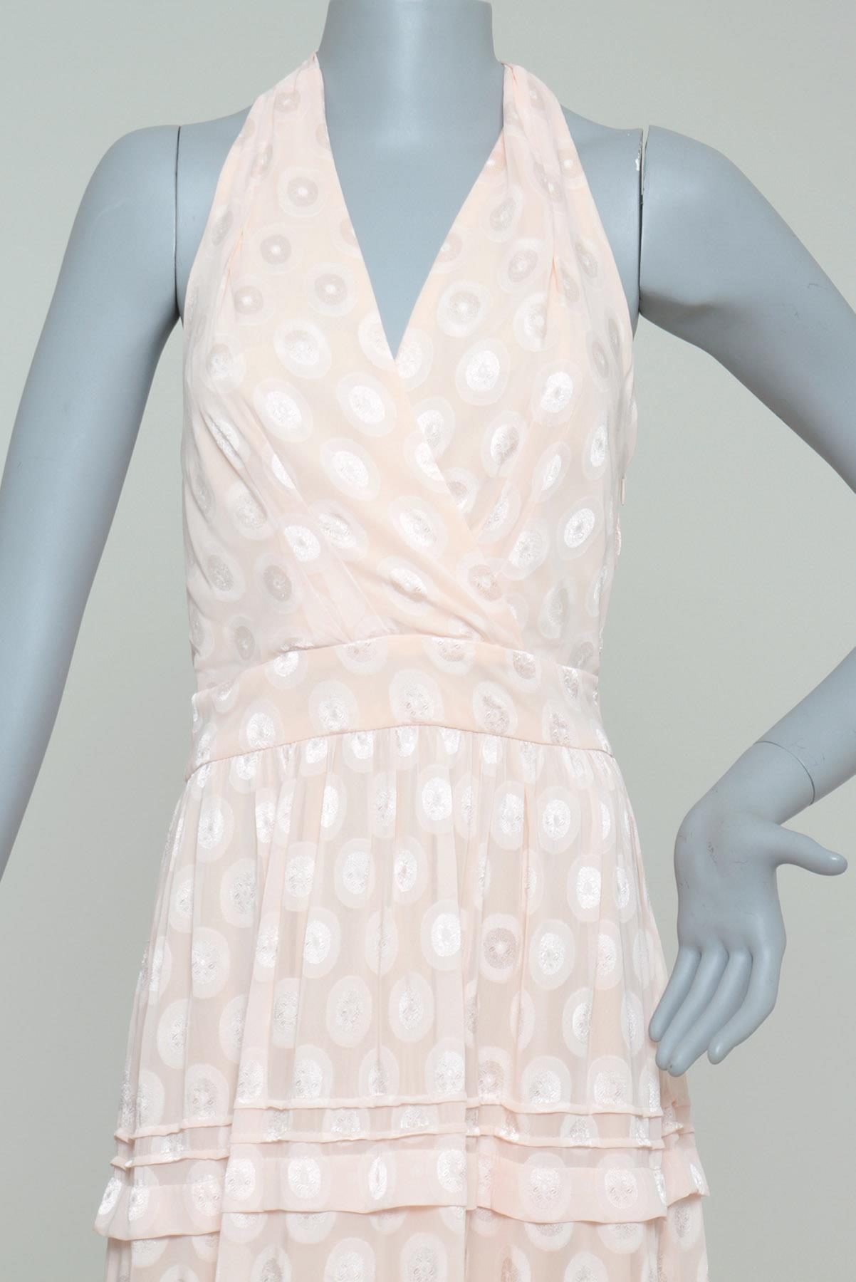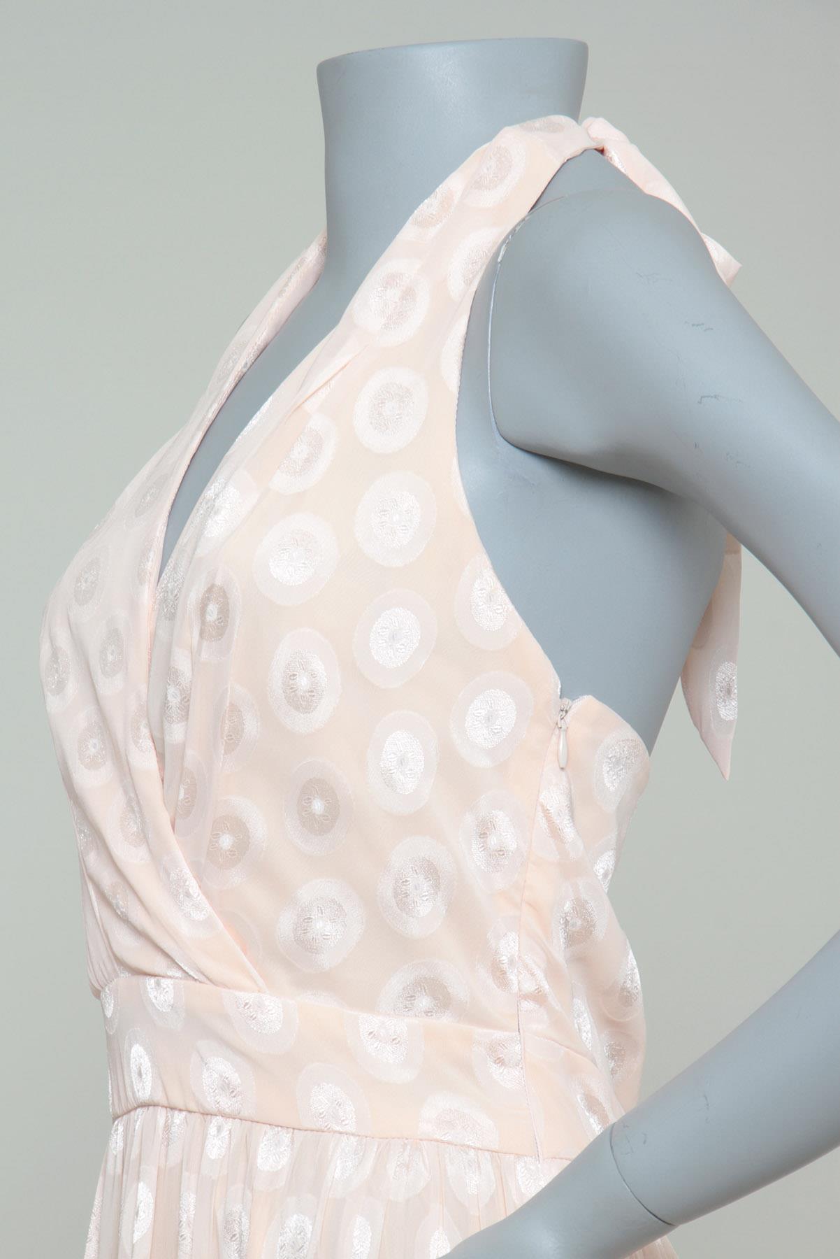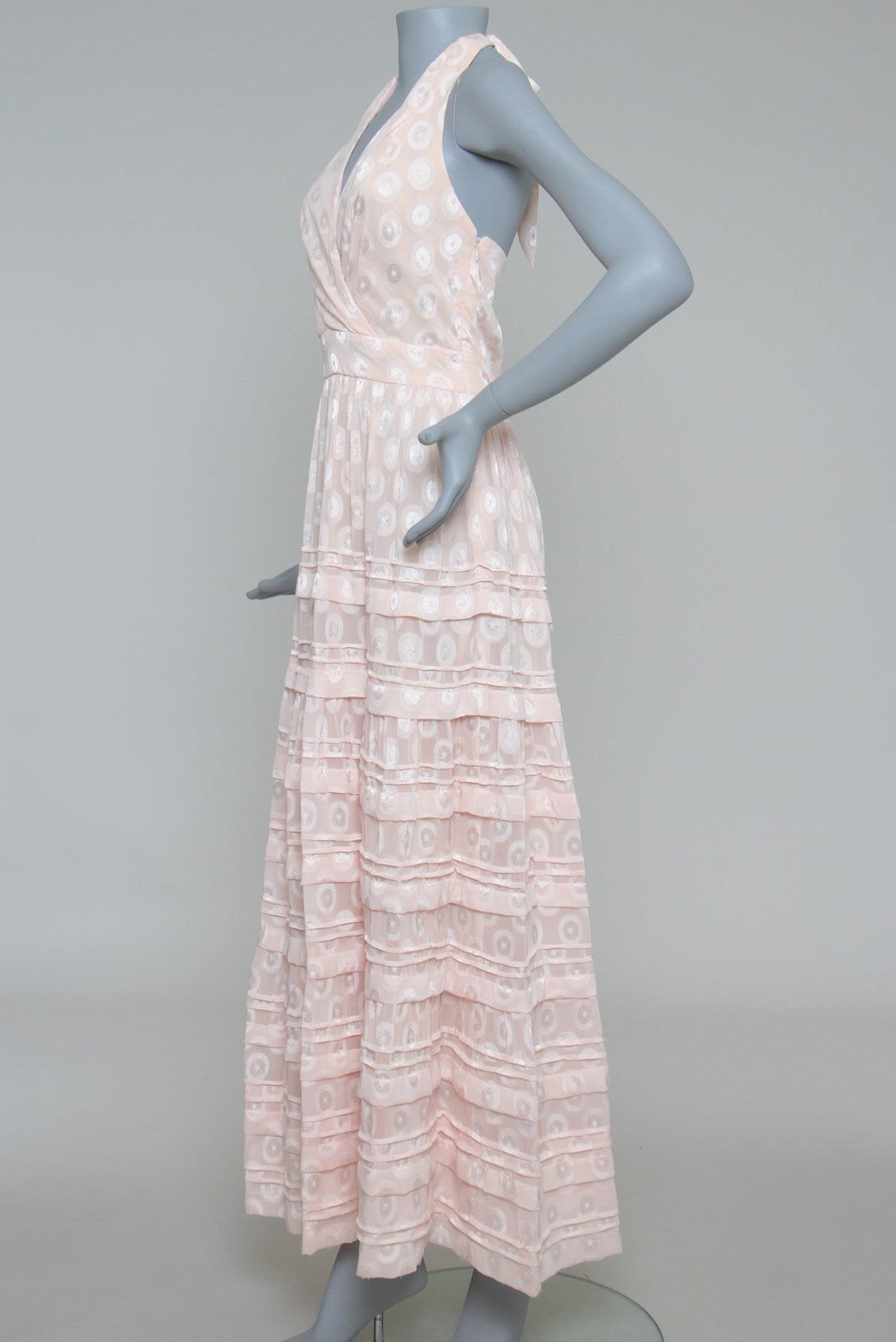 - Vestido em tecido fluído com leve brilho- Salmão claro- Tramado decorativo em formato de poás amplos- Modelagem evasê de comprimento longo- Decote frente única transpassado- Amarração traseira para ajuste ao corpo- Decote traseiro amplo- Saia em camadas- Zíper lateral para fechamento
