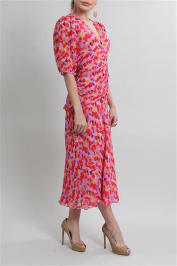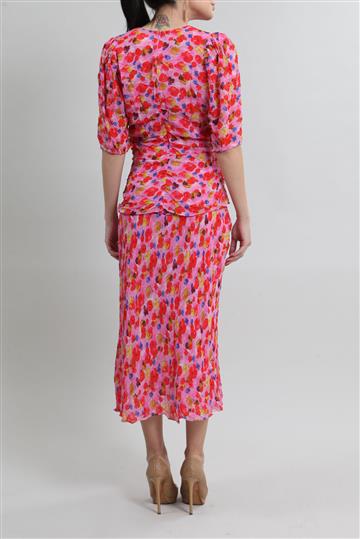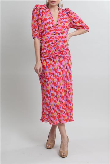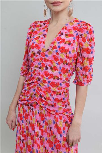 - Mangas curtas ligeiramente bufantes com pregueado superior
