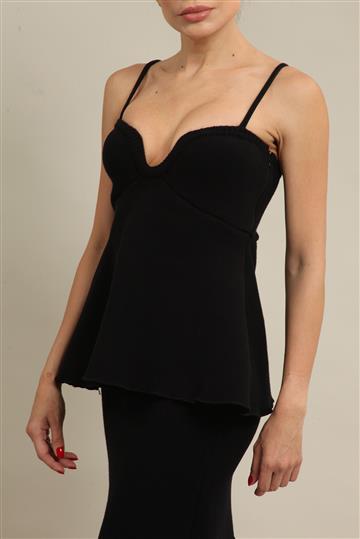 - Decote alongado em 'V' e busto ajustado