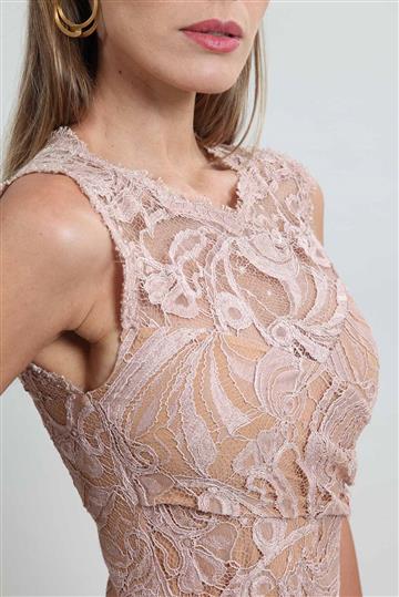 - Vestido em renda- Rosa antigo- Modelagem reta ajustada ao corpo- Decote arredondado- Cavas laterais- Transpasse frontal decorativo- Forro interno- Comprimento midi reduzido- Leve transparência- Fechamento posterior por zíper tratorado metálico
