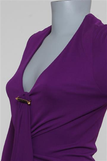 - Decote alongado em 'V' com pequeno adorno metálico frontal
