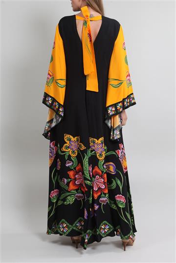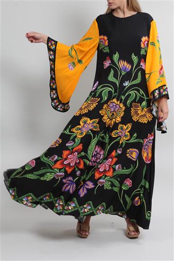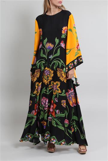 - Mangas longas amplas e fluidas estilo sino com punhos assimétricos