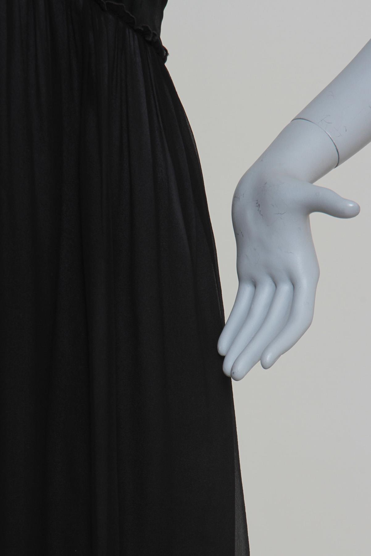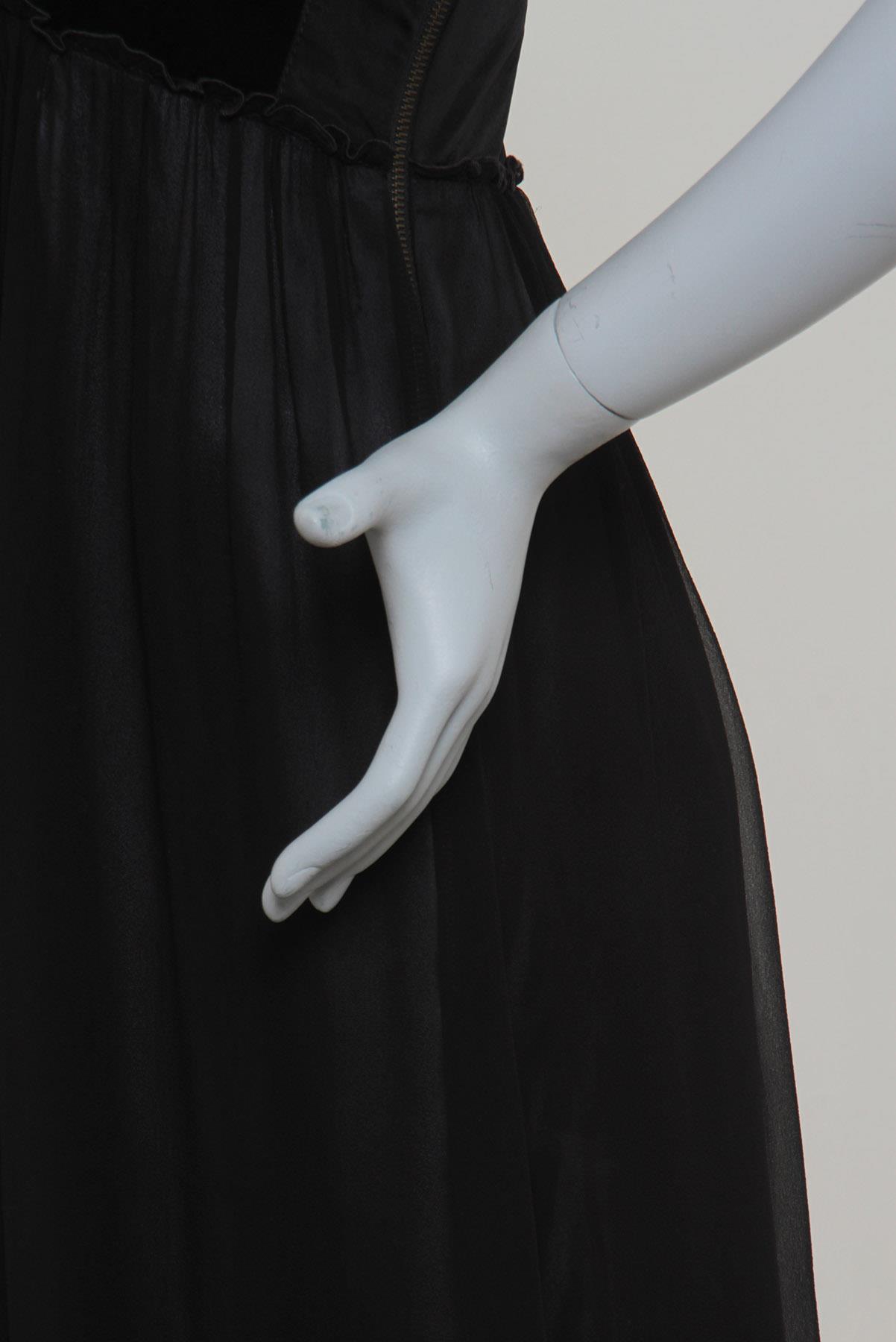 - Vestido em seda e veludo- Preto- Modelagem evasê- Decote em 'V' com pregas aparentes- Pala inferior em veludo- Alças finas sem regulagem- Pequenos babados decorativos- Comprimento curto- Fechamento lateral por zíper tratorado.
