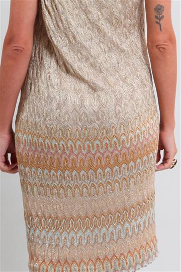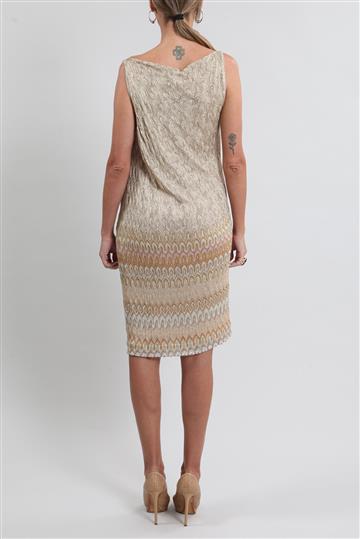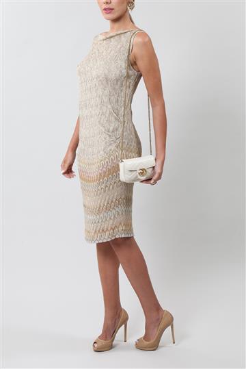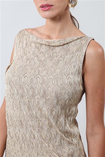 - Vestido em malha- Midi- Decote canoa- Sem mangas- Drapeado na lateral em tons de dourado e prata.- Não possui zíper nem botões.- Veste M