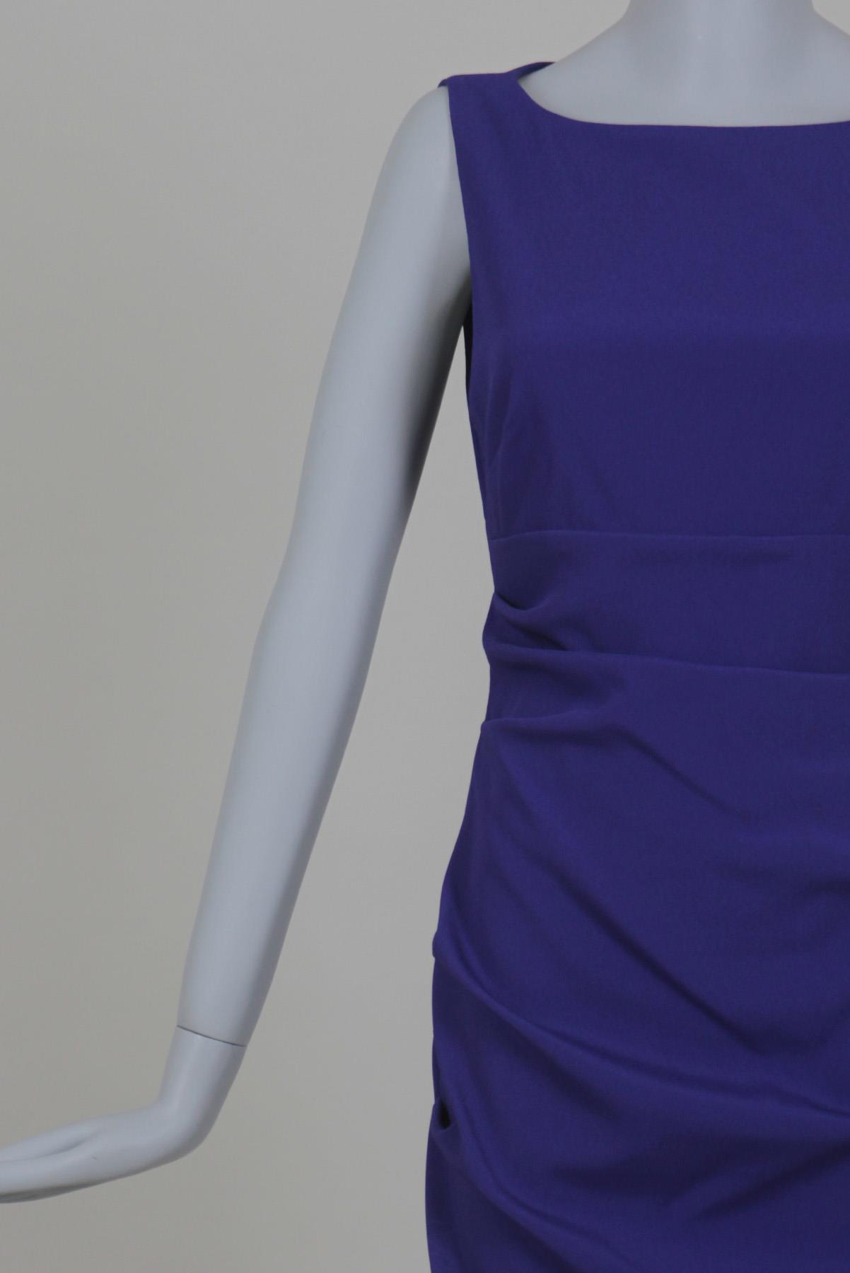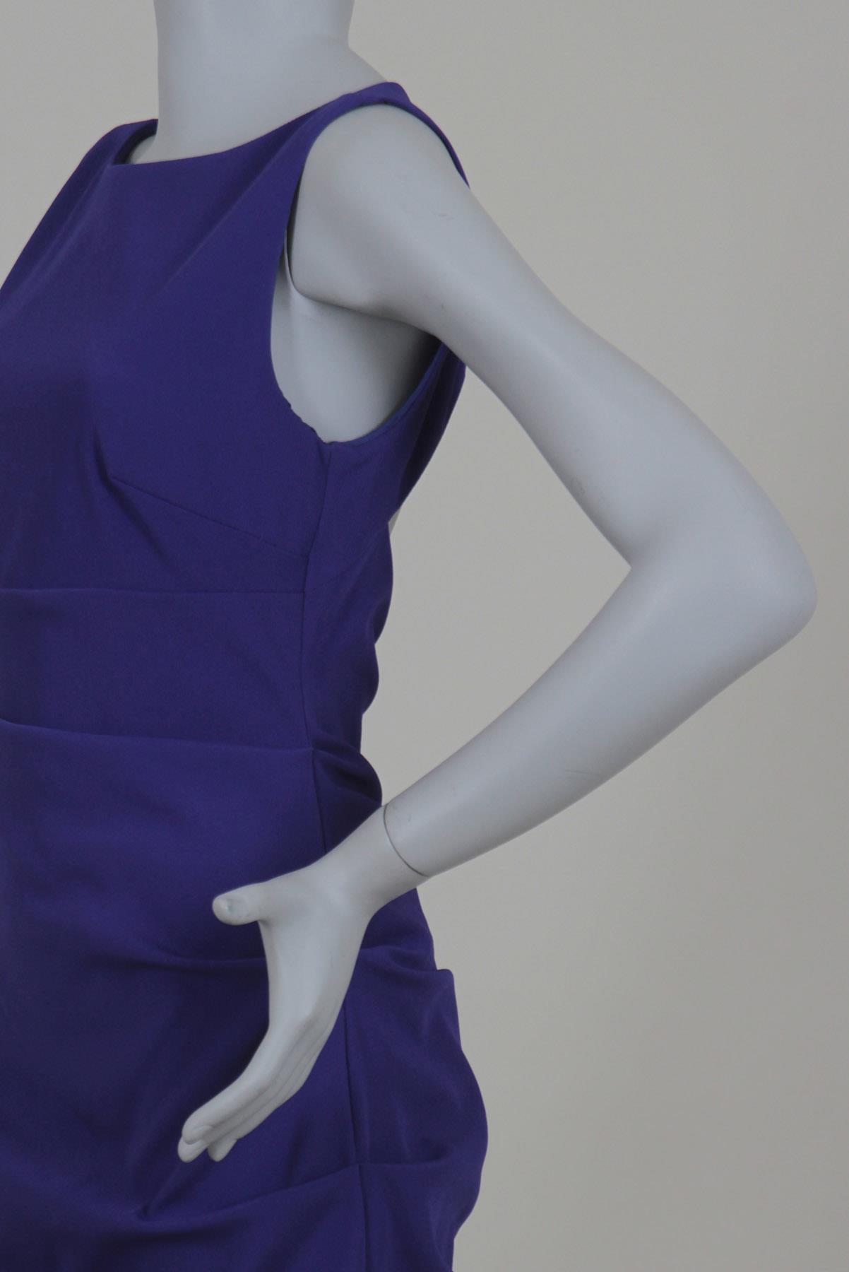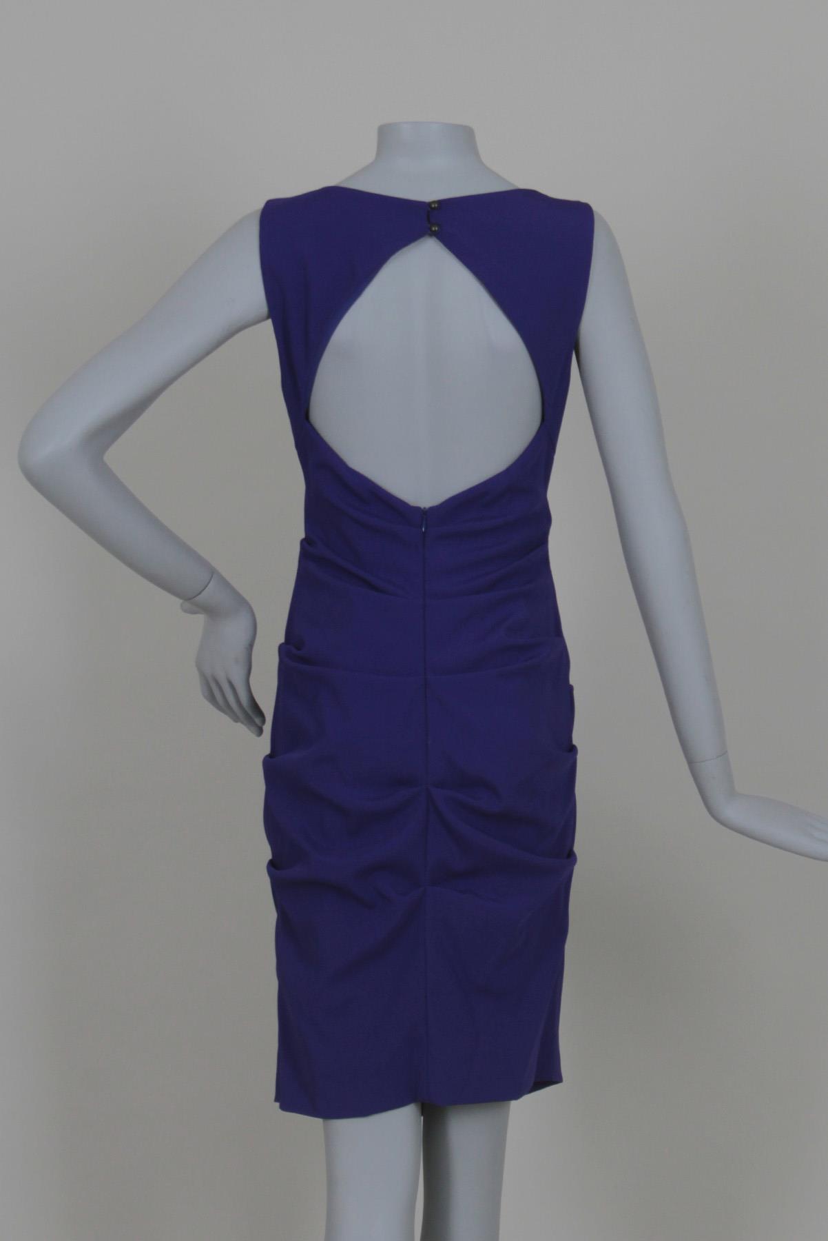 - Vestido em poliéster- Roxo púrpura- Comprimento curto- Modelagem drapeada ajustada ao corpo- Decote canoa fechado frontal- Cavas laterais- Recorte traseiro amplo com abotoamento- Drapeado lateral decorativo- Zíper invisível traseiro para fechamento.