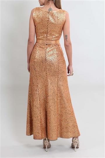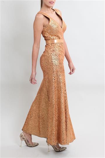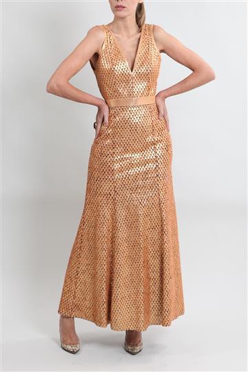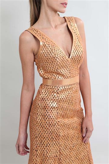- Vestido em tecido leve inteiramente revestido por pequenas escamas  em camurça metalizada