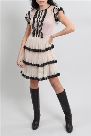 - Saia em camadas com pregas aparentes e boa fluidez