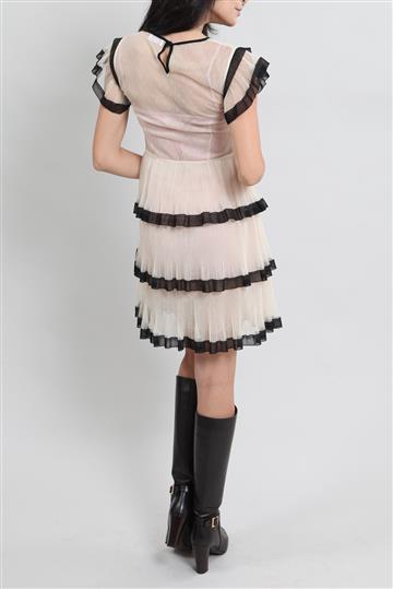 - Fechamento posterior por zíper aplicado e abotoamento delicado